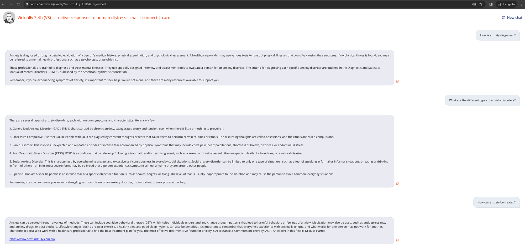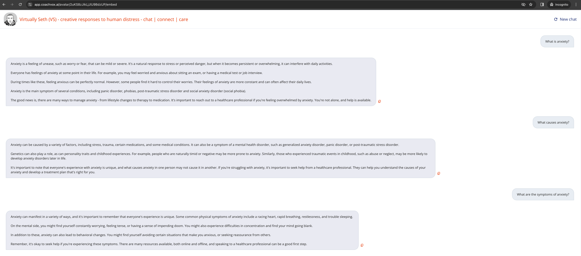 As a way to encourage you try out Virtually Seth what follows are the exchange of messages between me & Virtually Seth on the topic of anxiety. So offline Seth asking online Seth about anxiety. This particular exchange is less a conversation & more of a Q & A but in this example I simply wanted to showcase the depth of information & help Virtually Seth offers. I'm rather pleased with what I've created & hope you are impressed too!