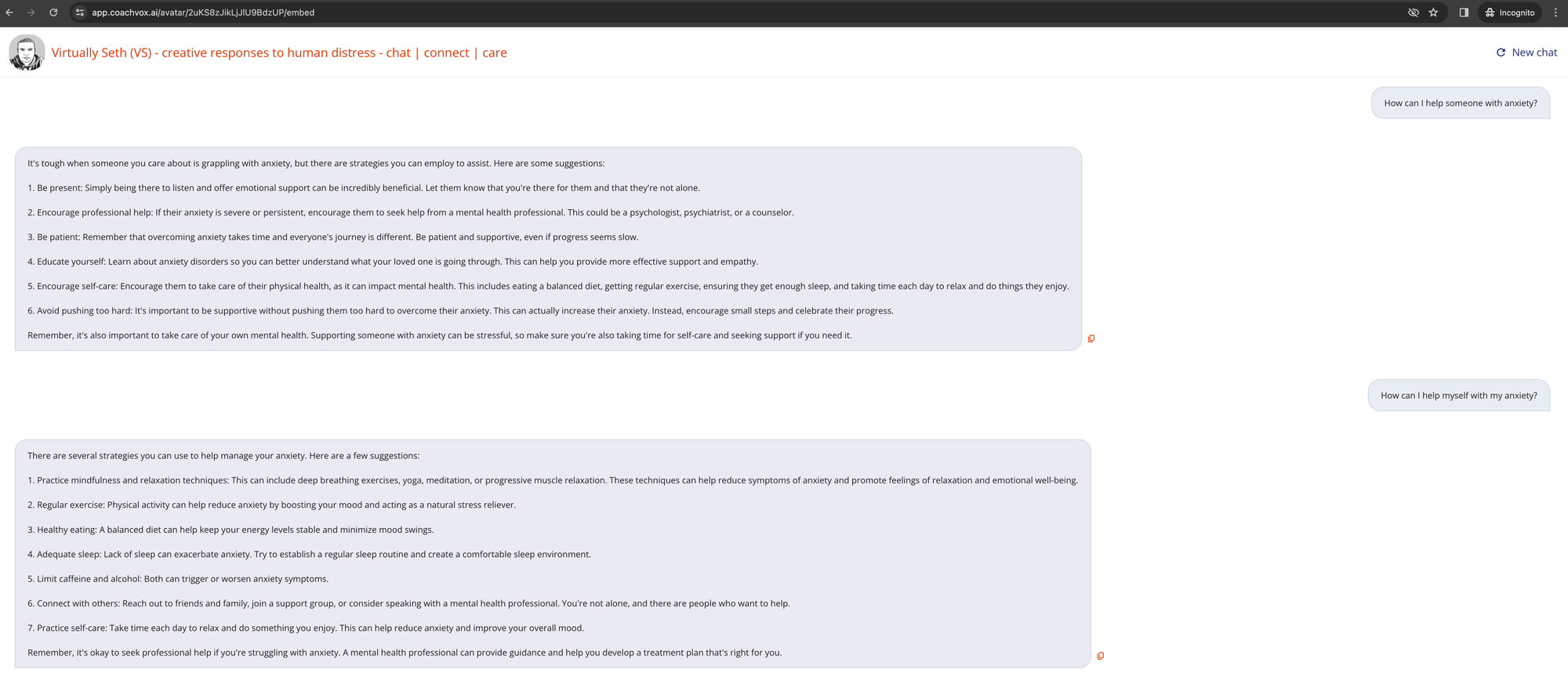 The beauty of my AI Virtually Seth is that it will only get better over time & that the more you use it the smarter 'I' become. It's free & confidential & accessible 24/7/365 on any phone, computer or tablet with an internet connection.